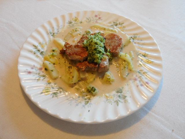 豚肉のクリームソースと塩じゃがいも (Rahmplätzli mit Salzkartoffeln)