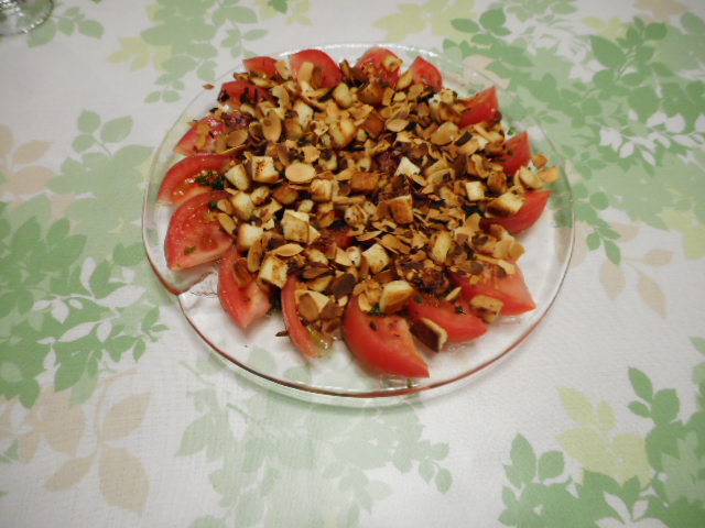 ボールに移してパセリと冷ましたアーモンドを加えてトマトの上にのせる。