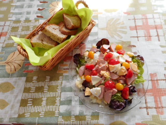 ラディッシュ、パプリカをいれた豪華バージョンのサラダにパンを合わせれば、メイン料理になります。
